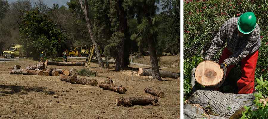 Left: Pines north of the Chinese Garden that succumbed to the bark beetle (also known as the five-spined ips) had to be cut down and removed. Right: Gardener Jose Lopez views Fusarium damage in a cross-section of a Liquidambar tree that fell victim to the polyphagous shot hole borer. Photographs by Lisa Blackburn.