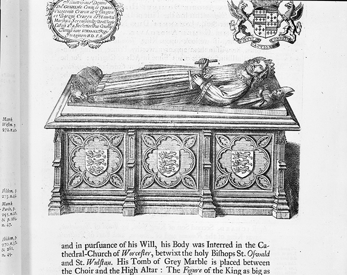 An image of King John’s tomb in Worcester Cathedral in England, from A genealogical history of the kings of England, and monarchs of Great Britain, &c. from the conquest, anno 1066 to the year, 1677, (1707), by Francis Sandford (1630–1694), rendered here in black and white. The Huntington Library, Art Collections, and Botanical Gardens.
