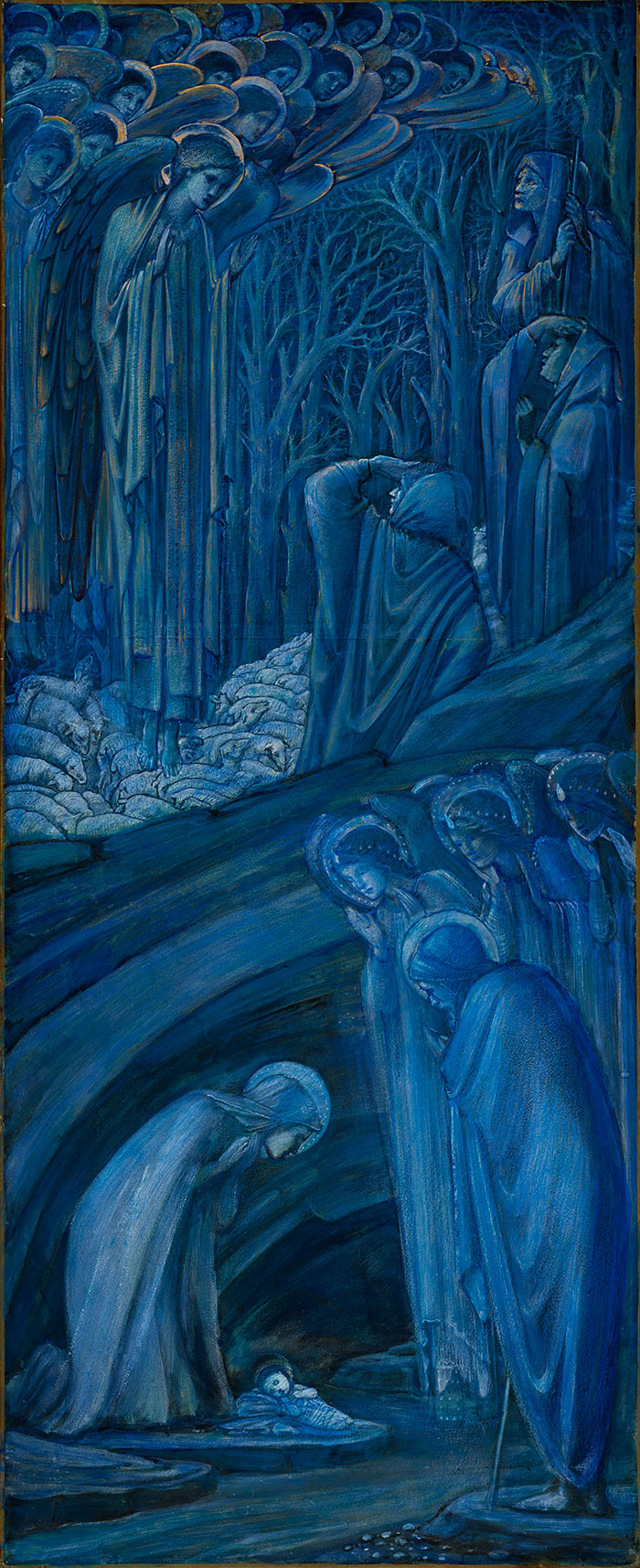 Artist Edward Burne-Jones (1833–1898) rendered this work—which measures almost five feet high—in various dreamy shades of blue offset with touches of gold. The elongated scene is divided into two sections by a swooping “S” curve, reminiscent of historiated letters in manuscript illuminations. In the upper portion of the painting, a crowd of angels appears before shepherds, who shield their eyes from the dazzling vision. The background is filled with a tangle of skeletal trees. In the lower portion of the painting, Mary, Joseph, and a small group of angels gaze at the infant Jesus in wonderment. Here the artist painted a cave in the background, creating a sense of protection and quiet piety that contrasts with the decorative brilliance above.
