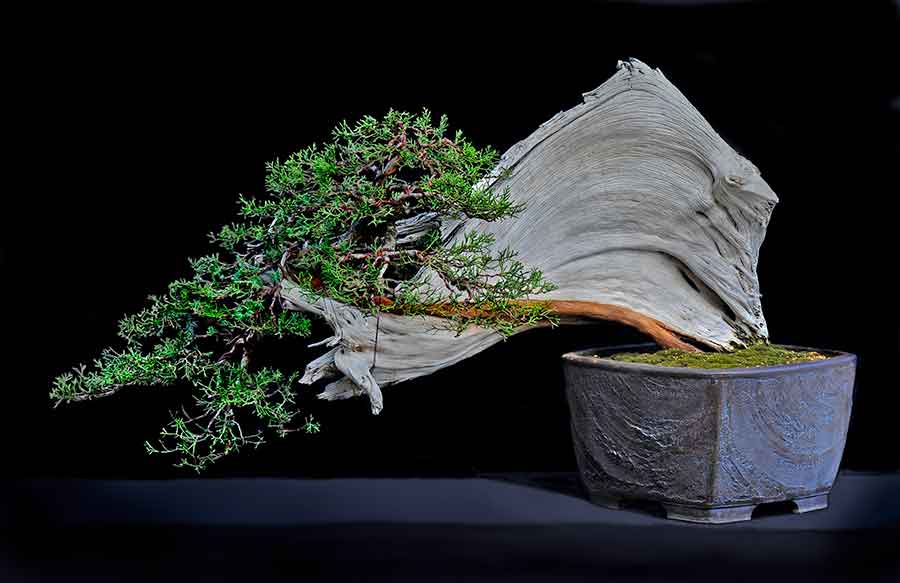 While a stylized, miniature tree may have been in cultivation as bonsai for only a few decades, the original plant material from which it was grown is usually much older—often by many centuries. A bonsai artist, searching for a promising specimen from which to style a miniature tree, will often reclaim a nearly dead stump found in nature, coaxing new growth from a withered branch or a slab of trunk in which a living vein of wood, its “lifeline,” still grows. The skeleton-like trunk becomes the foundation—both structurally and aesthetically—for the bonsai’s design. The tree’s lifeline becomes a visual element of the design, as well, and will produce new branches and foliage, trained and shaped under the bonsai artist’s care.