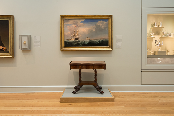 The mahogany Card Table is displayed beneath Sailing Ships off the New England Coast, circa 1855, by Fitz Henry Lane. Card Table, mid 19th Century. Unknown maker, American. Mahogany with satinwood and holly inlay, 29 3/8 x 34 x 18 5/8 in. (74.6 x 86.4 x 47.3 cm.). The Huntington Library, Art Collections, and Botanical Gardens. Photo by Kate Lain.