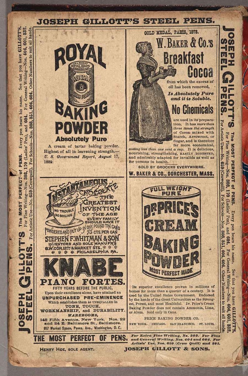 Back cover of Lippincott’s magazine, July 1890, displaying a variety of bold, visual advertisements. The Huntington Library, Art Museum, and Botanical Gardens.